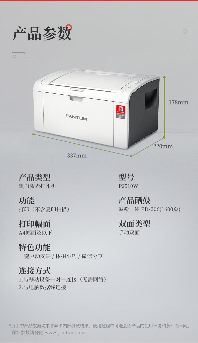 奔图(PANTUM)P2510W黑白激光无线网络WiFi家用打印机(WiFi打印/A4机身) 自营