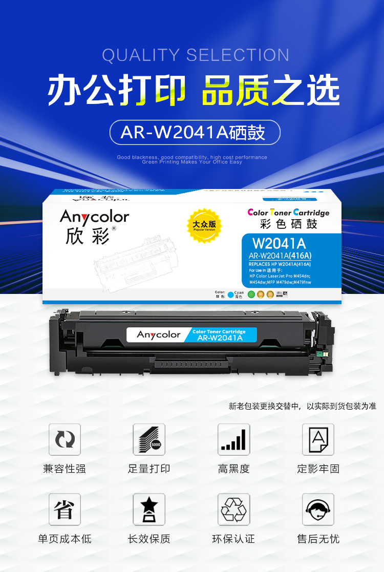 欣彩 W2041A硒鼓 AR-W2041A蓝色 416A带芯片 适用惠普M454dn M454nw M479dw M479fnw fdw fdn蓝色一支 自营